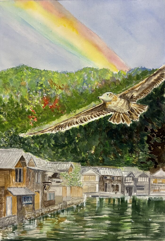 海沿いの舟屋と優雅に飛ぶ鳥、嘘の様な虹が彩りを添えています。